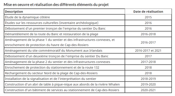 La localisation et la situation de la péninsule de Forillon la rendent particulièrement vulnérable aux aléas des changements climatiques et à l’érosion côtière. Cette problématique a d’ailleurs été identifiée depuis de nombreuses années. En effet, au début du 20e siècle, un chemin a été construit par les résidents sur le haut de plage dans le secteur de Cap-des-Rosiers. C’est en 1926 que la route du littoral est officiellement érigée entre le phare et le havre de Cap-des-Rosiers, directement sur la partie active du haut de plage. Rapidement, cette nouvelle route a dû être protégée par des caissons de bois emplis de pierres. Divers ouvrages de protection supplémentaires (mur de bois, talus de pierres) ont dû être mis en place au fil du temps afin de la protéger des intempéries. Les derniers en liste ont été un enrochement de protection d’environ 2 kilomètres érigé en 1980 ainsi qu’un mur de béton construit dans les années 1990. Les dommages causés à la route et aux infrastructures associées ainsi que l’érosion côtière se sont particulièrement accentués depuis le milieu des années 1990 et les ouvrages de protection ne suffisaient plus à la tâche. En 2011, une portion de la route a dû être abandonnée et relocalisée, car une brèche importante s’était créée dans l’enrochement et un câble électrique (15 000 volts) avait été endommagé. Le projet s’est échelonné sur une période de 7 ans, soit de 2015 à 2021.