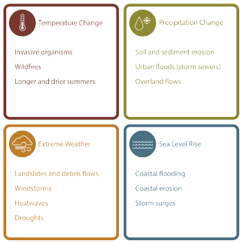 La conception des infrastructures a traditionnellement été réalisée par des ingénieurs et des planificateurs qui se penchaient sur les conditions climatiques passées; cependant, compte tenu des changements climatiques prévus (température, précipitations, conditions météorologiques extrêmes et élévation du niveau de la mer), ce n’est plus un indicateur approprié des conditions futures. Le district a recours à la modélisation climatique pour examiner l’éventail de changements climatiques prévus dans la région, tout en comprenant l’incertitude inhérente aux modèles climatiques. Les changements climatiques devraient avoir une incidence sur la capacité du district de maintenir les opérations et les services quotidiens actuels, sur les infrastructures et les systèmes du district (p. ex., les conditions météorologiques changeantes et l’élévation du niveau de la mer endommagent les infrastructures grises, les infrastructures vertes et les actifs écologiques), sur les parcs et l’environnement (p. ex., le district possède divers actifs écologiques inestimables et irremplaçables, des marais salés à des prairies alpines, dont beaucoup devraient être considérablement modifiés par les changements climatiques), et sur la santé et la sécurité (p. ex., une augmentation des phénomènes extrêmes peut avoir des répercussions négatives sur la qualité de vie de la communauté et un risque accru pour la santé et la sécurité des personnes). En comprenant ces types de changements et les incertitudes qui y sont associées, les groupes de travail intersectoriels ont examiné les répercussions du climat futur sur les infrastructures, l’environnement, le personnel, les résidents et les intervenants du district. Le district reconnaît que l’adaptation est une occasion d’accroître la résilience en réduisant les coûts à long terme grâce à une gestion des actifs fondée sur le risque, à une gestion et à une protection environnementales proactives et à des systèmes de sécurité publique améliorés.