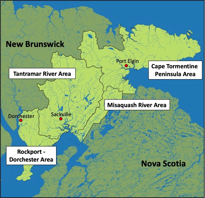 The monitoring region covers 30 sites across four sub-watersheds located within the Chignecto Isthmus: Cape Tormentine Peninsula, Tantramar River, Misaquash, and Johnson Creek (see figure below). Sites were chosen with the goal of monitoring a variety of different land uses. Because of the large territory and large number of sites, EOS staff visit one region per year. Because of provincial border restrictions due to COVID-19 and ongoing uncertainty during the pandemic, they have not yet monitored the Misaquash watershed which lies on the border between NS and NB.