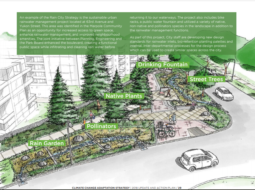 Image of a sustainable urban rainwater management project in the City of Vancouver. The schematic includes incorporation of greenscaping as a way of not only beautifying the streetscape, but also to provide functional purposes such as rainwater management and small areas of habitat refugia. The image shows the integration of sustainable design with climate adaptation actions. Specific foci are on the inclusion of more city street trees, native plants, areas for pollinators, rain gardens, and the creation of common spaces for gathering.