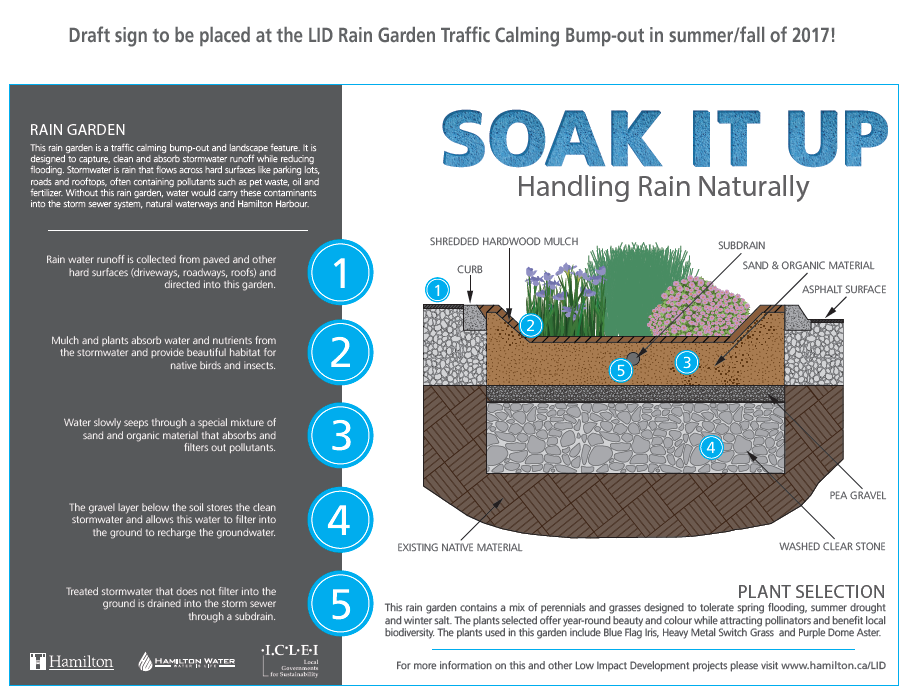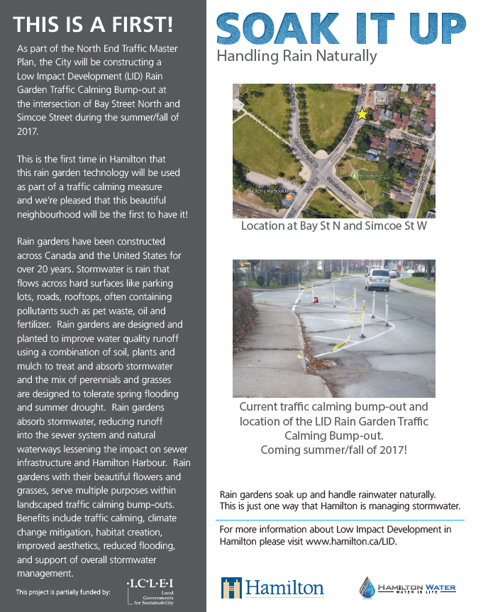 This case study addresses the climate impacts risks and vulnerabilities related to extreme precipitation events. In the last decade, the City of Hamilton has experienced many unprecedented heavy rainstorms, such as events in 2009 and 2013, causing devastating damages to both private properties and public infrastructure as a result of flooding. As such, it is critical for the City to implement a diverse set of stormwater management strategies, including Low Impact Development (LID). Currently, the City of Hamilton is working on implementing their North End Traffic Management Plan, the purpose of which is to resolve neighbourhood traffic and transportation problems through the application of traffic improvement measures, including the installation of temporary traffic calming measures. This provided an excellent opportunity for the City to include a rain garden at a new road bumpout site in order to pilot the use and implementation of LID. Ultimately, the City hopes to make LID a standard practice in their suite of stormwater infrastructure solutions through pilot implementation.