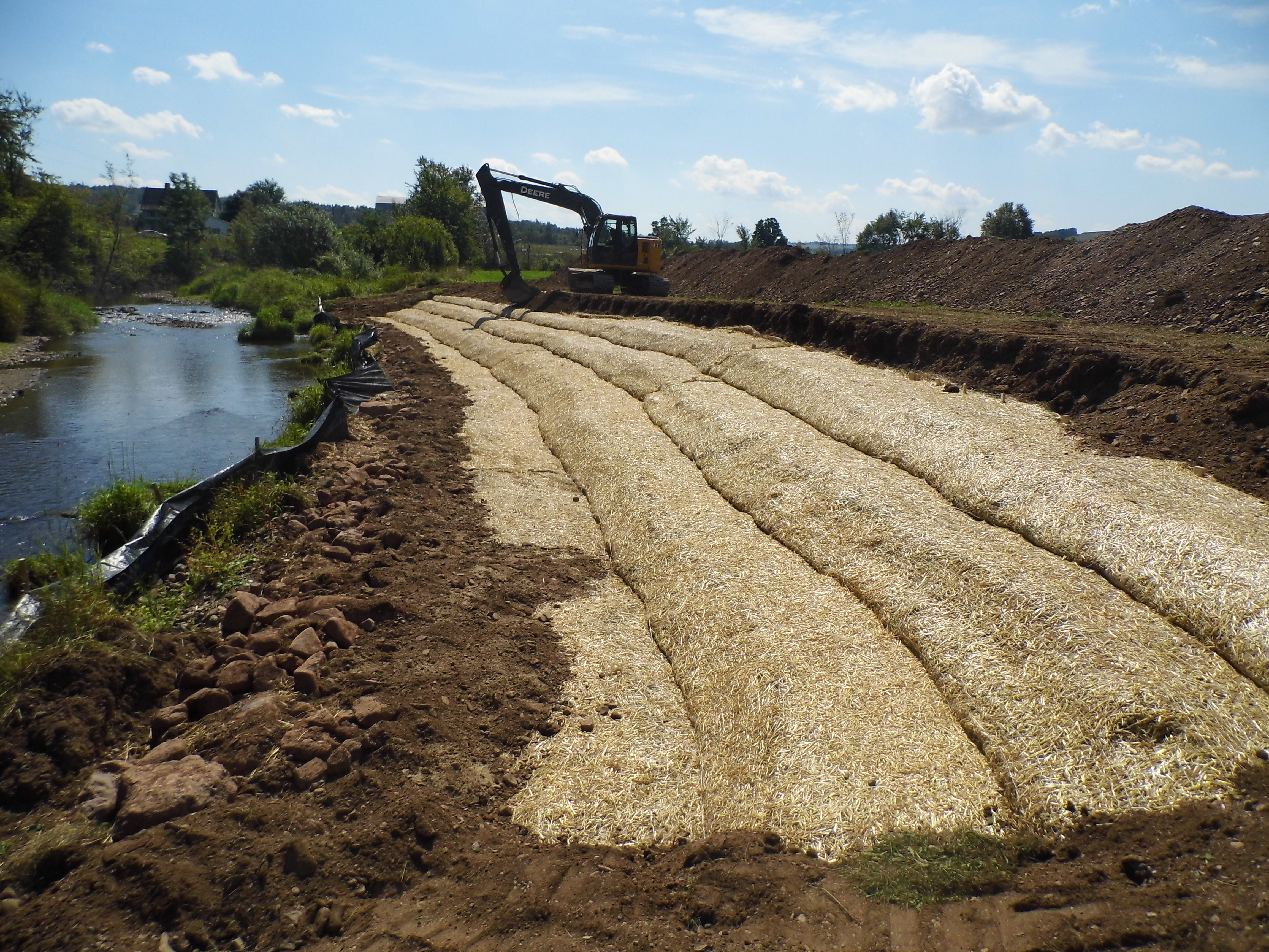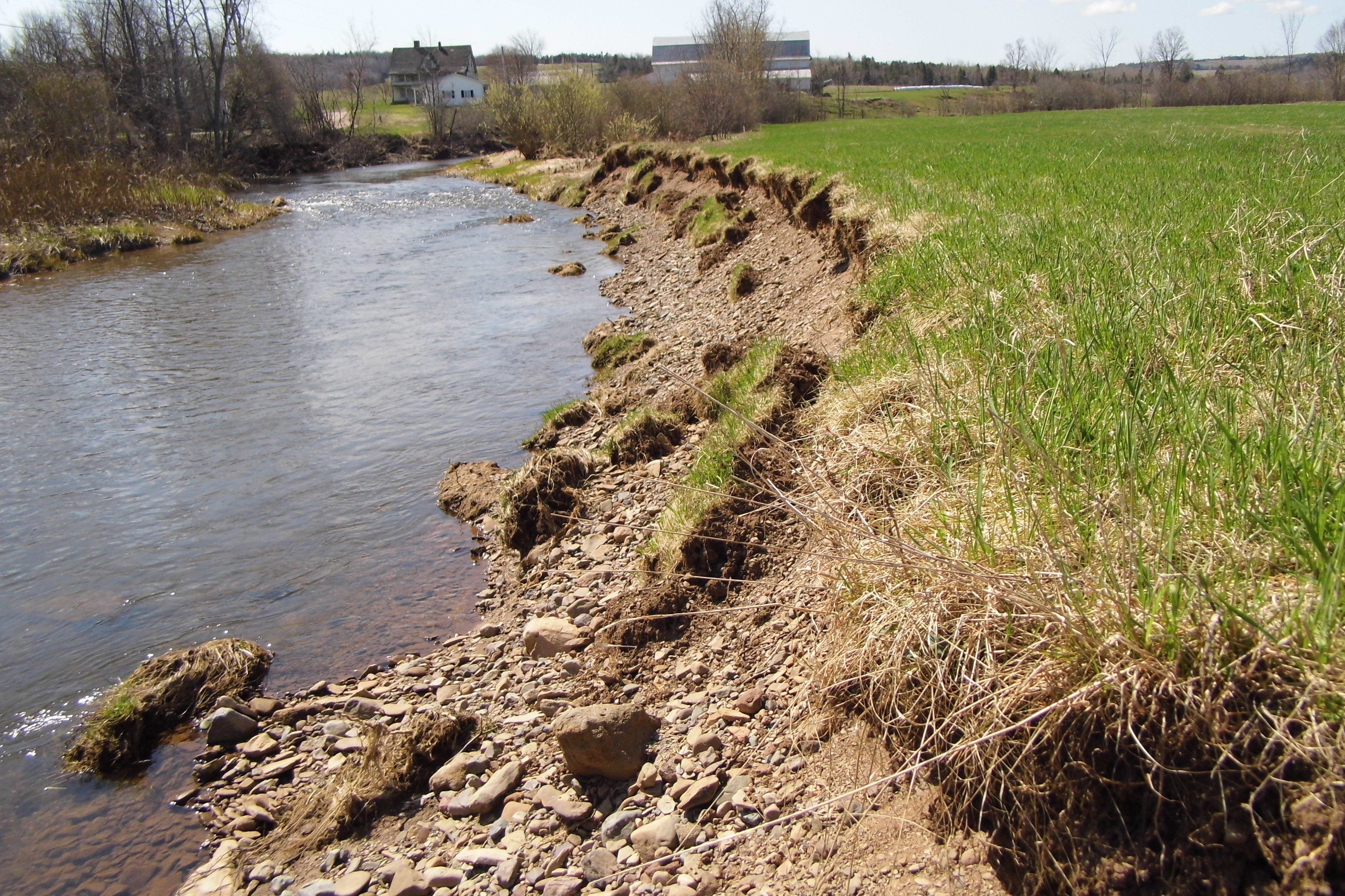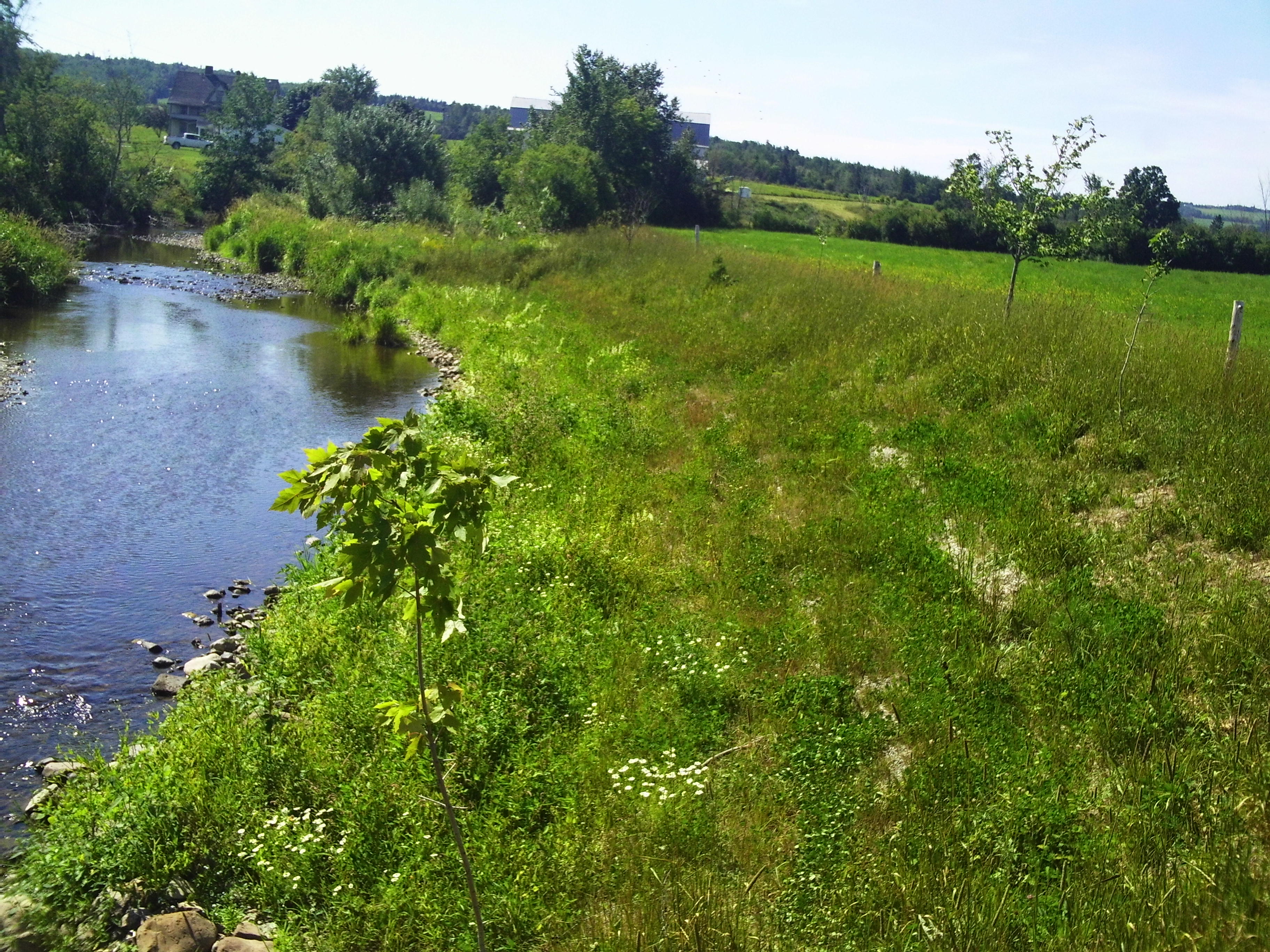 The Kennebecasis Restoration initiative began with a comprehensive habitat assessment of 285.5 km of stream. The results of this assessment highlighted the need to address elevated stream temperatures and degraded riparian zones to improve the health of the watershed. To address concerns over eroding banks and degraded riparian habitat, a restoration project was developed and implemented. Approximately 78% of the Kennebecasis Watershed consists of forested lands, with 19% consisting of agricultural and occupied lands. Agricultural, residential, and other occupied lands directly influence the water quality and habitat conditions of the watershed through cattle grazing, riparian vegetation removal, and agricultural and municipal runoff. Residential areas as well as rural residences, dot the entire length of the Kennebecasis River and its tributaries. Industries such as a potash mine, sawmills, and fish hatcheries are located throughout its reaches. Recreational industries including two golf courses can also be found on the Kennebecasis tributaries. Ward’s Creek is a key tributary of the Kennebecasis and in 2013 the KWRC identified a priority site on this Creek. In 2014, the bank was heavily eroded with a steep slope and minimal vegetation.